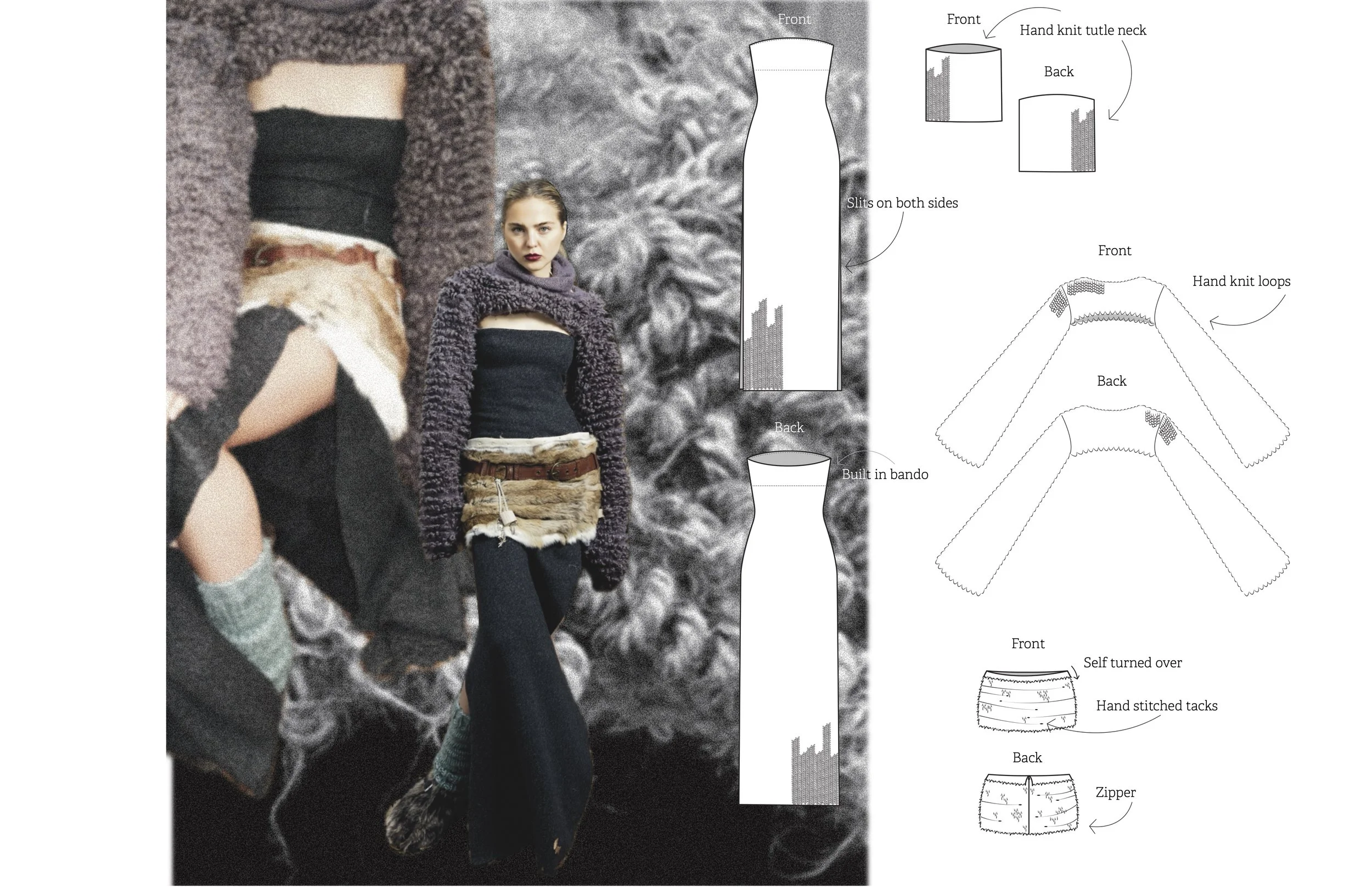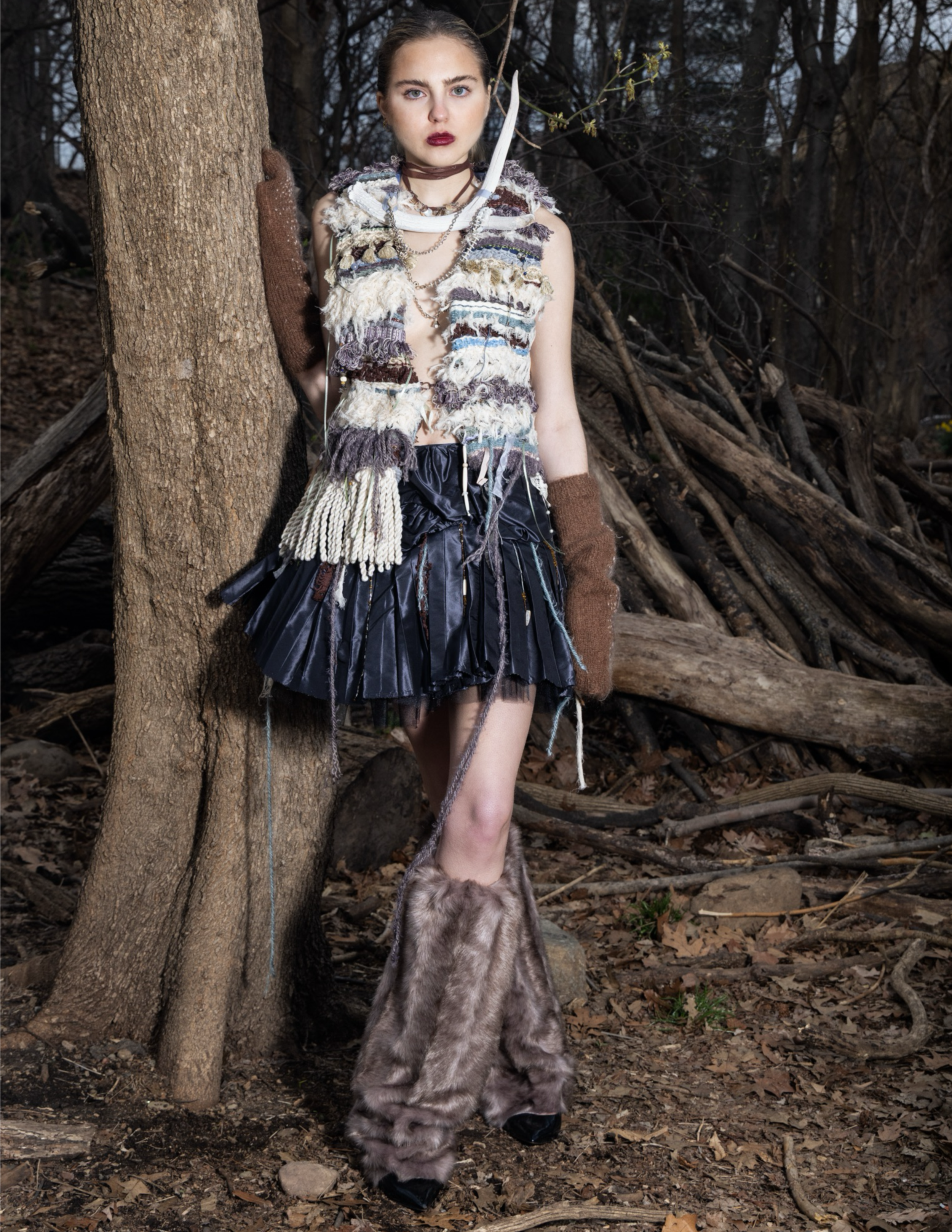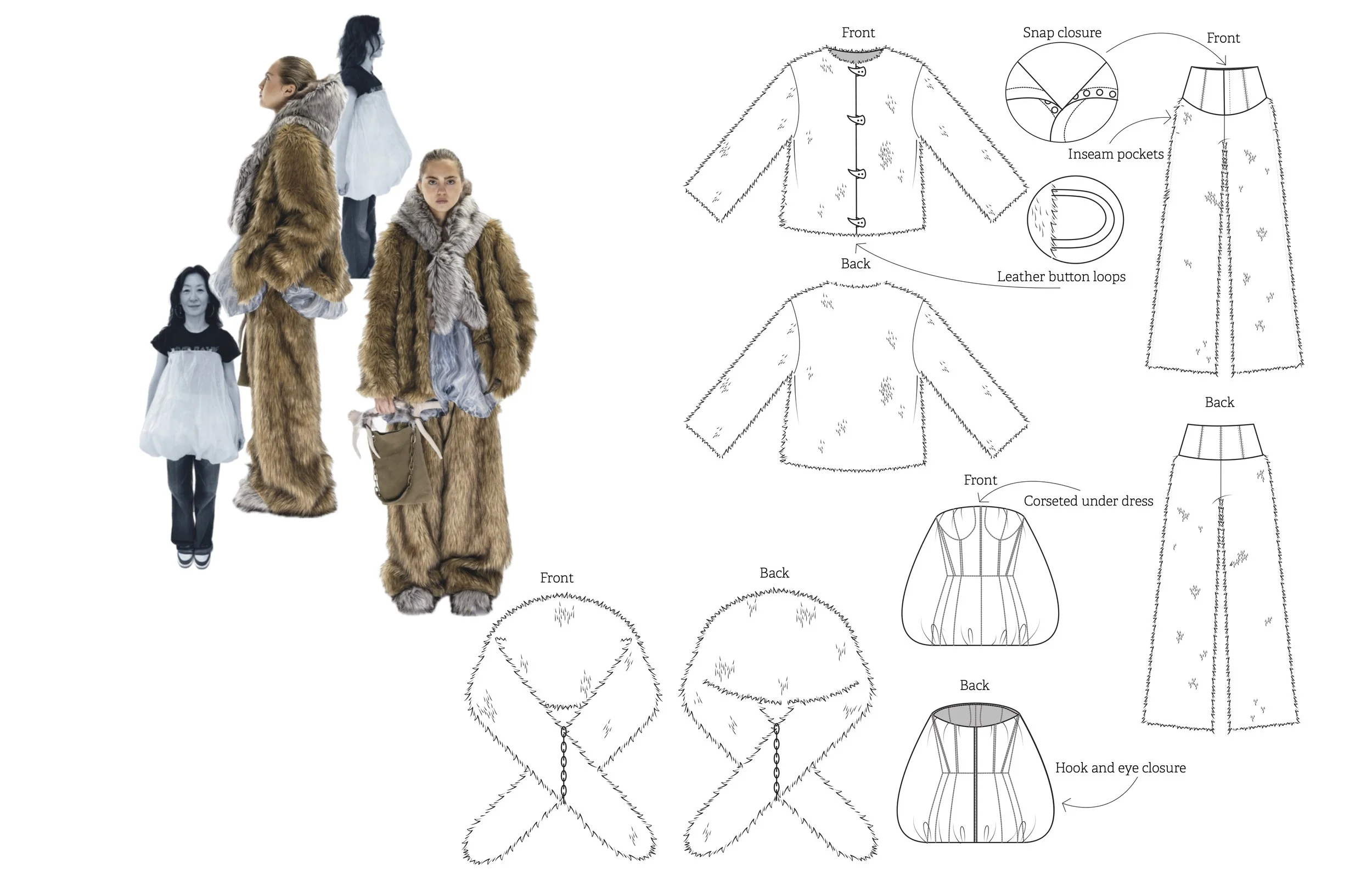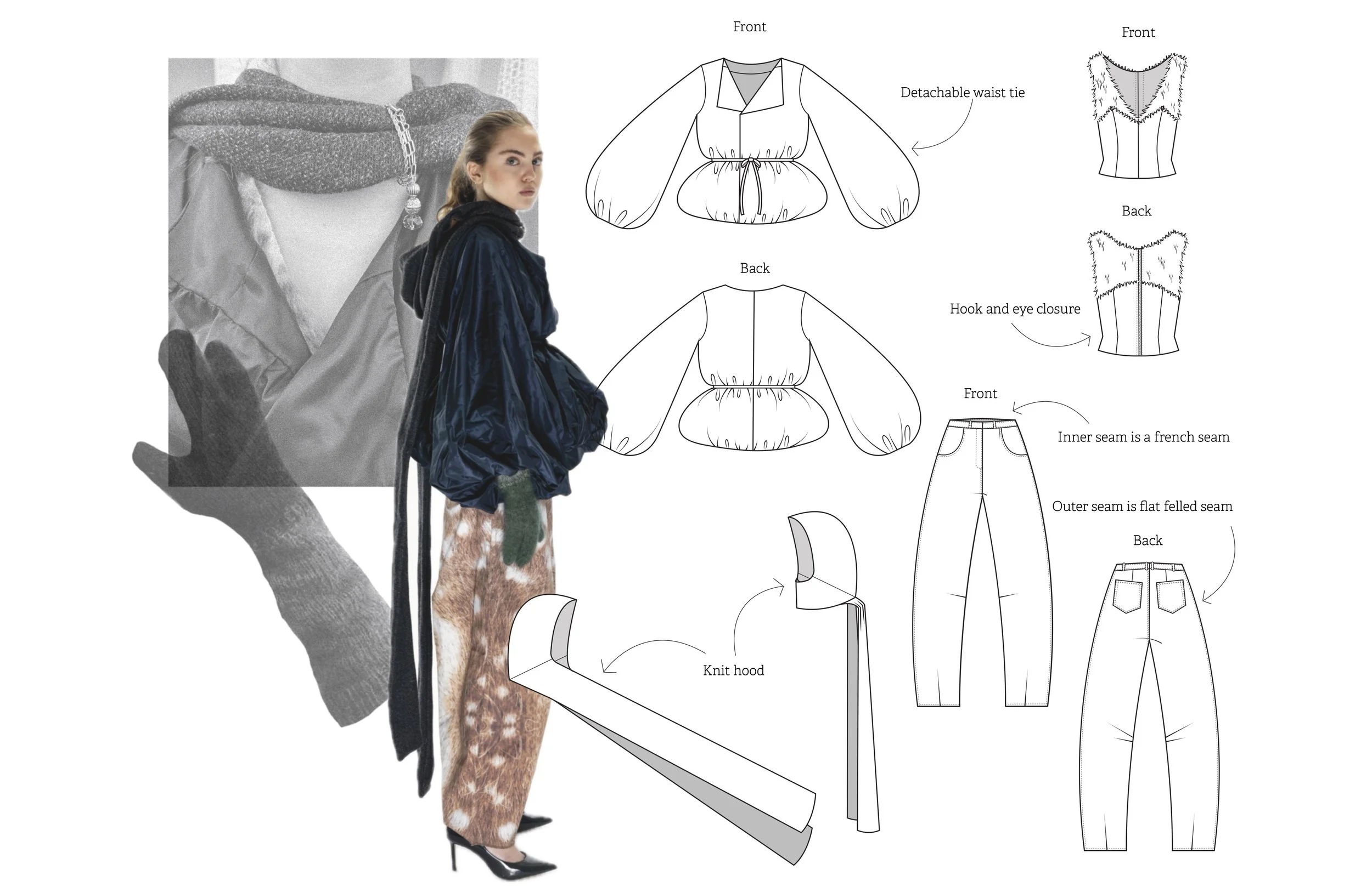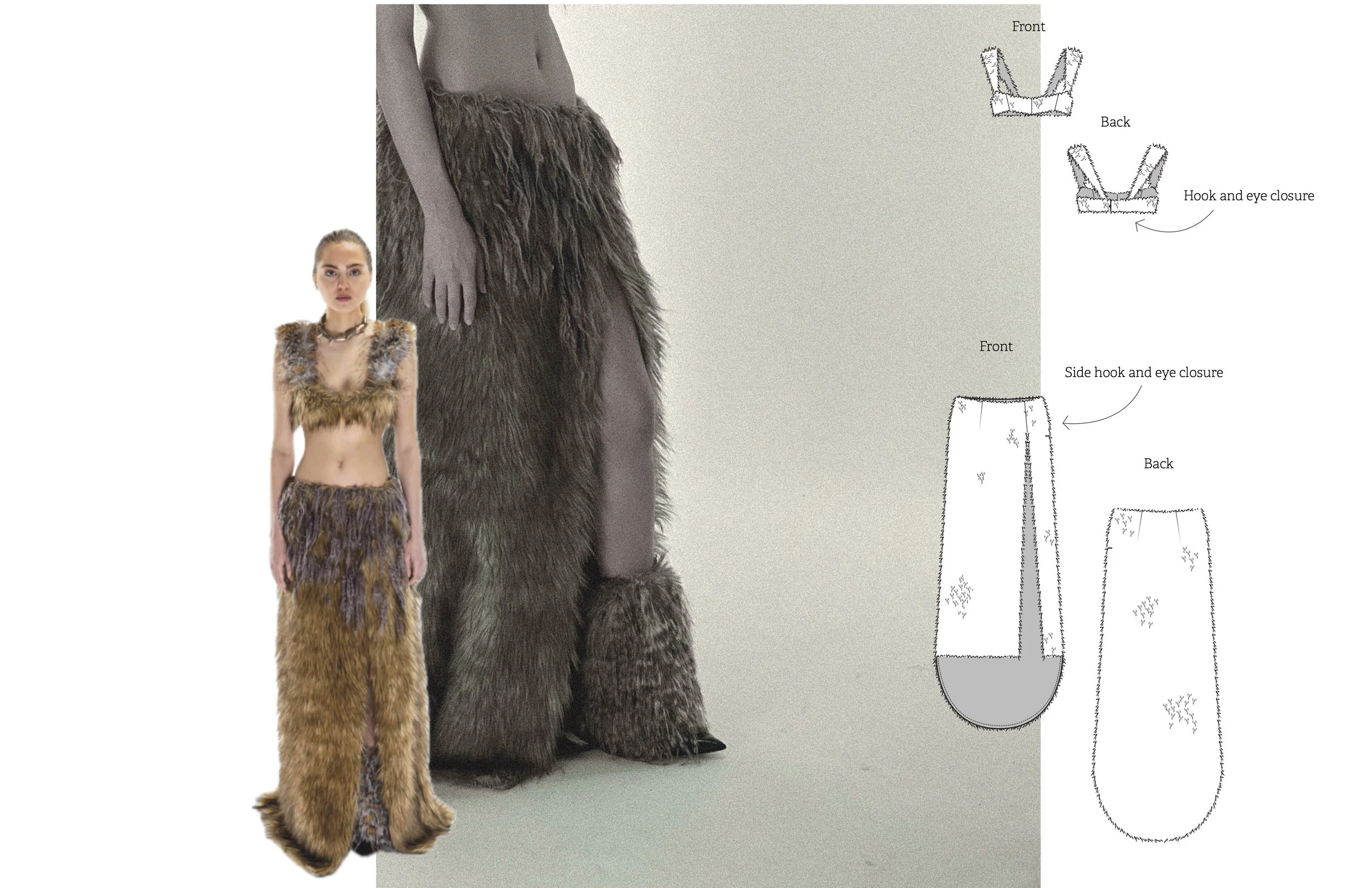 The research for Veil of Myth centers on how mythological figures emerge as responses to fear, control, and humanity’s evolving relationship with nature. Drawing from Horkheimer and Adorno’s Dialectic of Enlightenment, the work examines the tension between rational thought and myth-making, questioning why societies continue to rely on symbolic creatures even as they attempt to dominate the natural world. Research focused on folkloric figures such as the jackalope, Krampus, the Yule Goat, and the deer that blur the boundaries between reality and the supernatural and often embody moral instruction. Visual research was informed by Charles Fréger’s Wilder Mann, which documents ritualized costume and performance and channels myth through the human body. Together, these references connect folklore, philosophy, and ritual dress, forming a research framework that directly informed how myth is translated into silhouette, materiality, and surface within the designs.